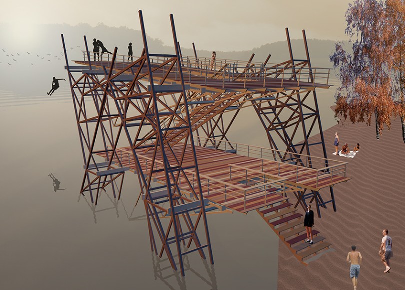 The slender, delicately built structure seems to have emerged without a specific author, or at least without a concrete intention behind the design, reminding the viewer more of a patch of undergrowth or a thorny thicket than a man-made artifact. As if it had always been there, it fits perfectly into the natural environment. This metaphorical wireframe structure creates an open, transitory space. With its large number of crisscrossing lines, this space lends corporeal form to a sense of airiness and lightness, evoking a nearly intangible framework or web of thoughts. The classic division between “inside” and “outside” is blurred, and it becomes a locus of “in-between,” linking the shore and the lake, between the shaded forest and the wide-open horizon. A place for Argonauts, for those about to set sail. And also a place of extravagance or eccentricity. Suspended into the vertical, it frames the landscape like a window, enclosing it and giving it power and impact at the same time. Seemingly disorganized and interwoven at random, like felt or a tangle of driftwood, this artificial BIRD’S NEST fits naturally into this ecologically valuable, sensitive natural area. The different-colored woods used for the structure all come from the immediate area, and some pieces could even be gathered as deadfall from the surrounding woods.