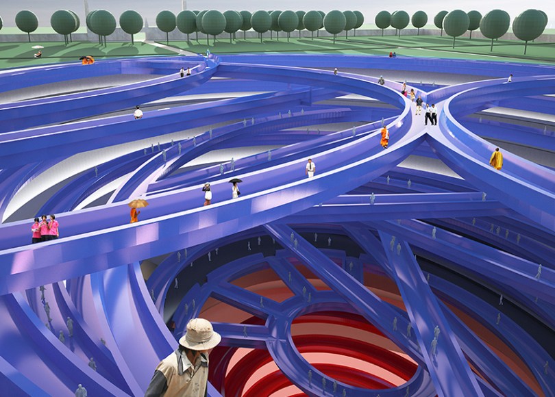Concept _Our proposal avoids any visual conflict with the White Taj Mahal. It’s absolutely outstanding position as a worldwide known cultural heritage cannot be touched. Therefore we designed a negative architecture: smooth ramps guide the visitors down to a space of dusk and dawn with an intense atmosphere of being confounded with the grave questions of life and death. There is no traditional design approach in our proposal. It’s a present design and uses all the capabilities of contemporary construction and fabrication technologies. However: It is contextualized by referring to the famous negative architectures of indian fountain buildings like Chand Baori and others. And the 3D-knot of the elliptically ramps is referred to the famous Mughal tradition of (circular) ornaments. We solved the problem of a possibly vain conflict in relation to the White Taj Mahal by keeping the above-ground view totally free of interventions. And while the White Taj Mahal is an architectural complex which lays in the horizontal, our Black Taj is directed in the vertical as a kind of time axis: the visitors see no horizon anymore, they see only the sky above and the Mughals tomb on the ground of a deep hole.