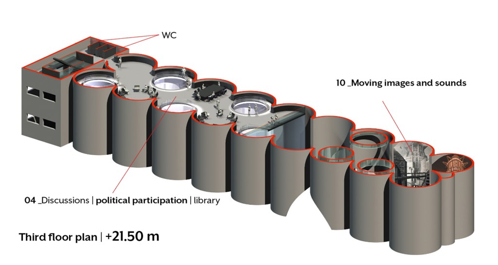 Inscribed in the programming of the building are a gallery for contemporary arts, are spaces for experimental video and sound installations, for media art (VR/AR), a library and spaces for spontaneous and informal gatherings of socio-political participation. At the ground floor we propose the following uses: Information, café, book store, and a gamescape for children. In the southern section, the tubular radial geometry of the silos provides ideal stages for performances by actors, dancers and poets.