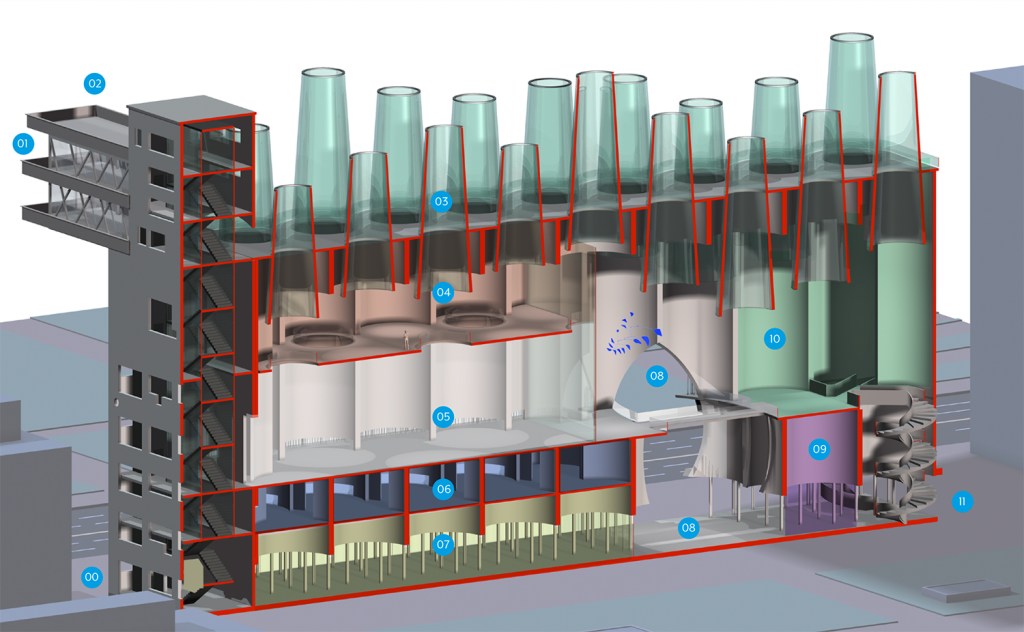 The building becomes a landmark with a far-reaching identity because its tubular-vertical silo geometry is enhanced by very tall, slightly tapered glass bodies that project deep into the building, creating constantly changing lighting moods in the building, and extend far beyond the silos. These enigmatic glass bodies glow delicately and multicolored like holograms. Visible from afar, they rhythmize the urban panorama and, as semi-transparent volumes, extend the towering verticality of the silos into infinity. The bulky building thus seems to breathe in and out, seems to be in motion. We look at this equilibristic play of the glass bodies as a silent music.