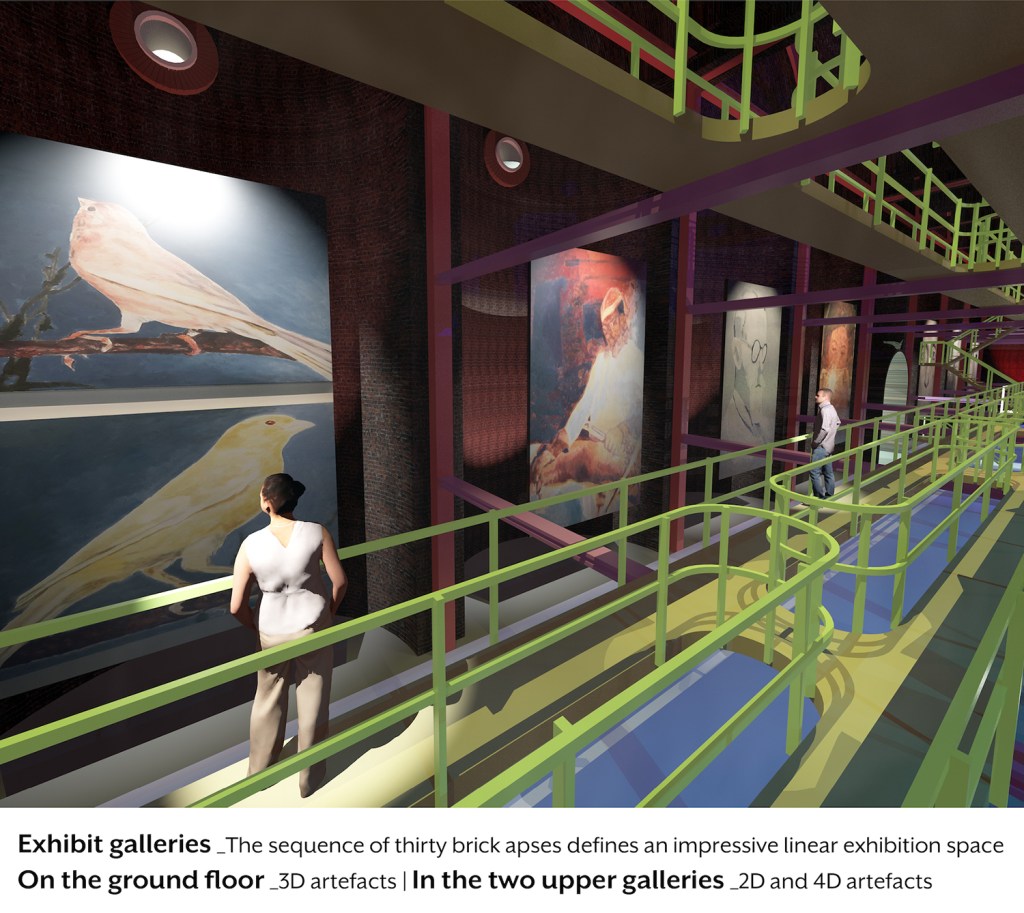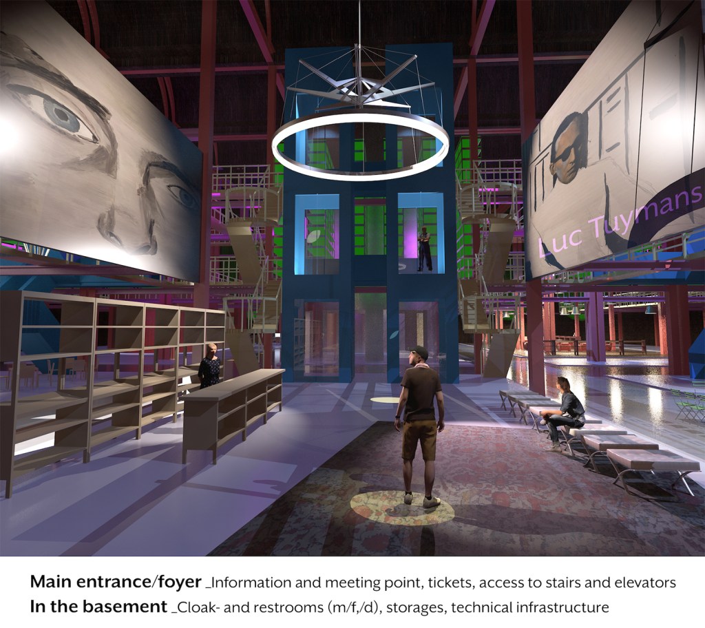 Thirty semicircular towers give the façade a vertical rhythm that is reminiscent of sacred architecture. By contrast, the interior opens onto a vast 4,700 m² hall with an impressive height of 18 metres, evoking the typology of a hangar rather than a wine cellar. This interplay of vertical and horizontal elements gives the space depth and presence. Delicate metal walkways, which were once part of the technical infrastructure, have been retained and now hover like drawn lines in space, subtly structuring the volume and void. However, the original wine tanks will be removed, as they obstruct the visual continuity of the space and have no meaningful programme value.
