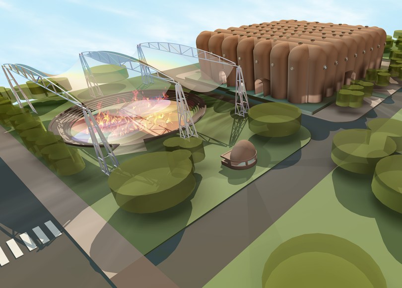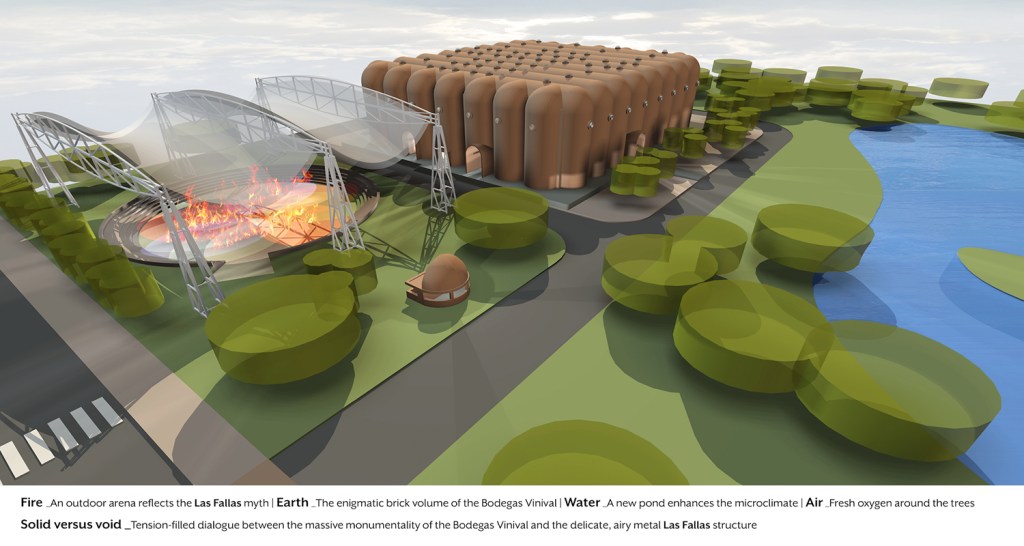 To provide a spatial counterpoint to the enclosed Bodega, an open-air arena has been proposed nearby, set slightly below ground level. Covered by a light, permeable steel structure, the arena offers shelter without enclosure. The contrast between mass and lightness, darkness and openness frames a spatial dialogue of dualities: volume versus void – protection versus exposure. The precisely staged performances in the dimly lit Bodega contrast with the partially archaic wildness of the Las Fallas festivities held in the open-air amphitheatre.